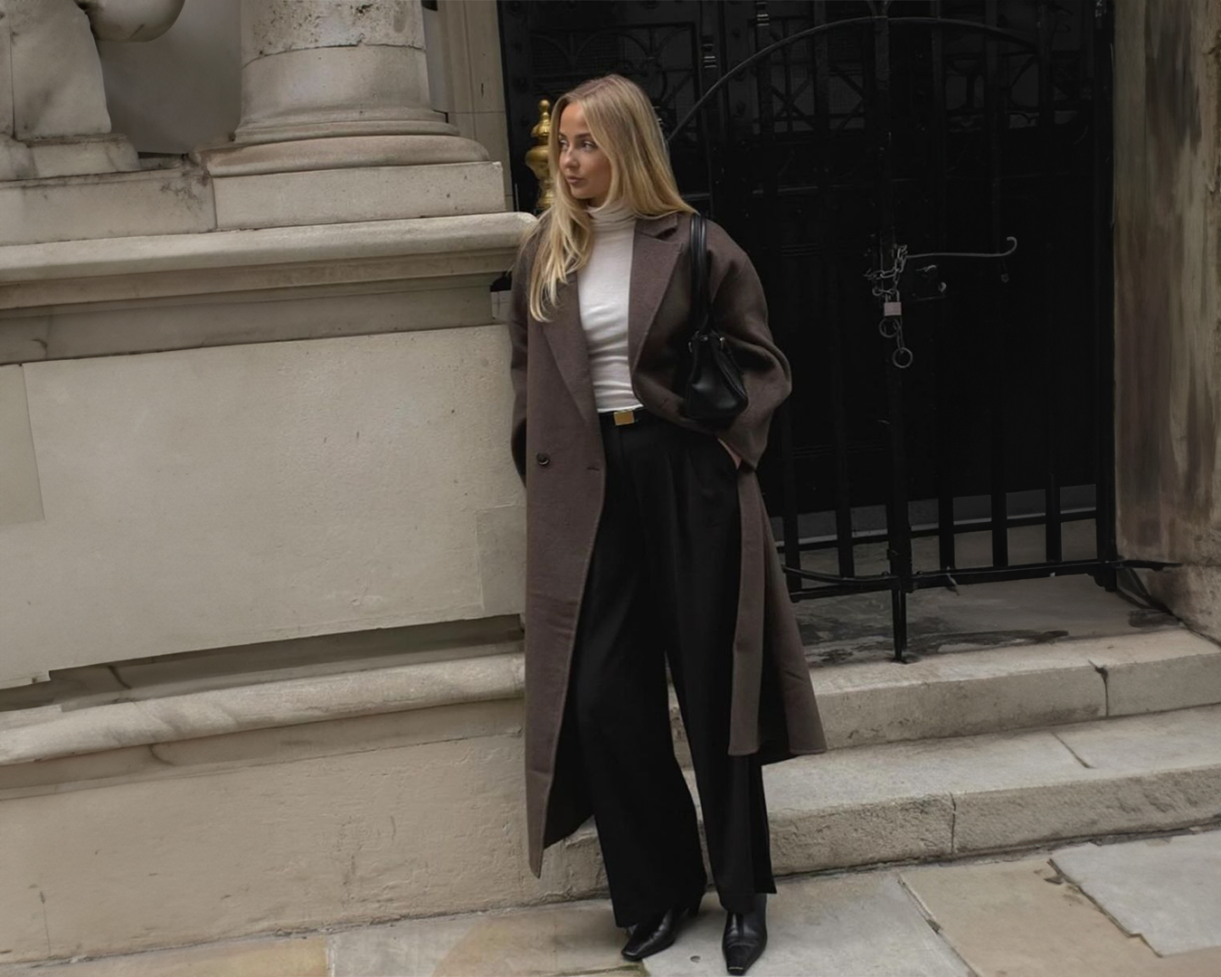 The exact coat, trousers, and accessories from the campaign — nothing more, nothing less.