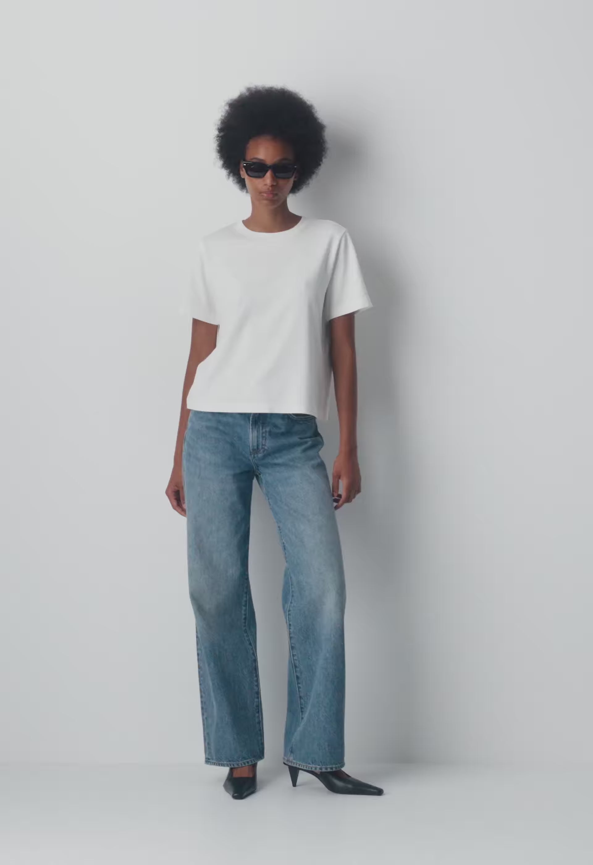 Inspired by bold, adventurous '70s icons, The Farrah is Denim Forum’s signature classic-fit wide-leg jean. With a high rise and slim hip, The Farrah hugs the figure and flares gradually out from the leg, ending in a clean hem. They're cut from heavyweight, non-stretch denim that molds to your body over time. This fabric is sourced from a premier Italian mill and made with 100% regenagri-certified regenerative cotton. So go ahead, ride a skateboard. Fight crime. But do it with big hair. This version comes in a medium indigo wash.